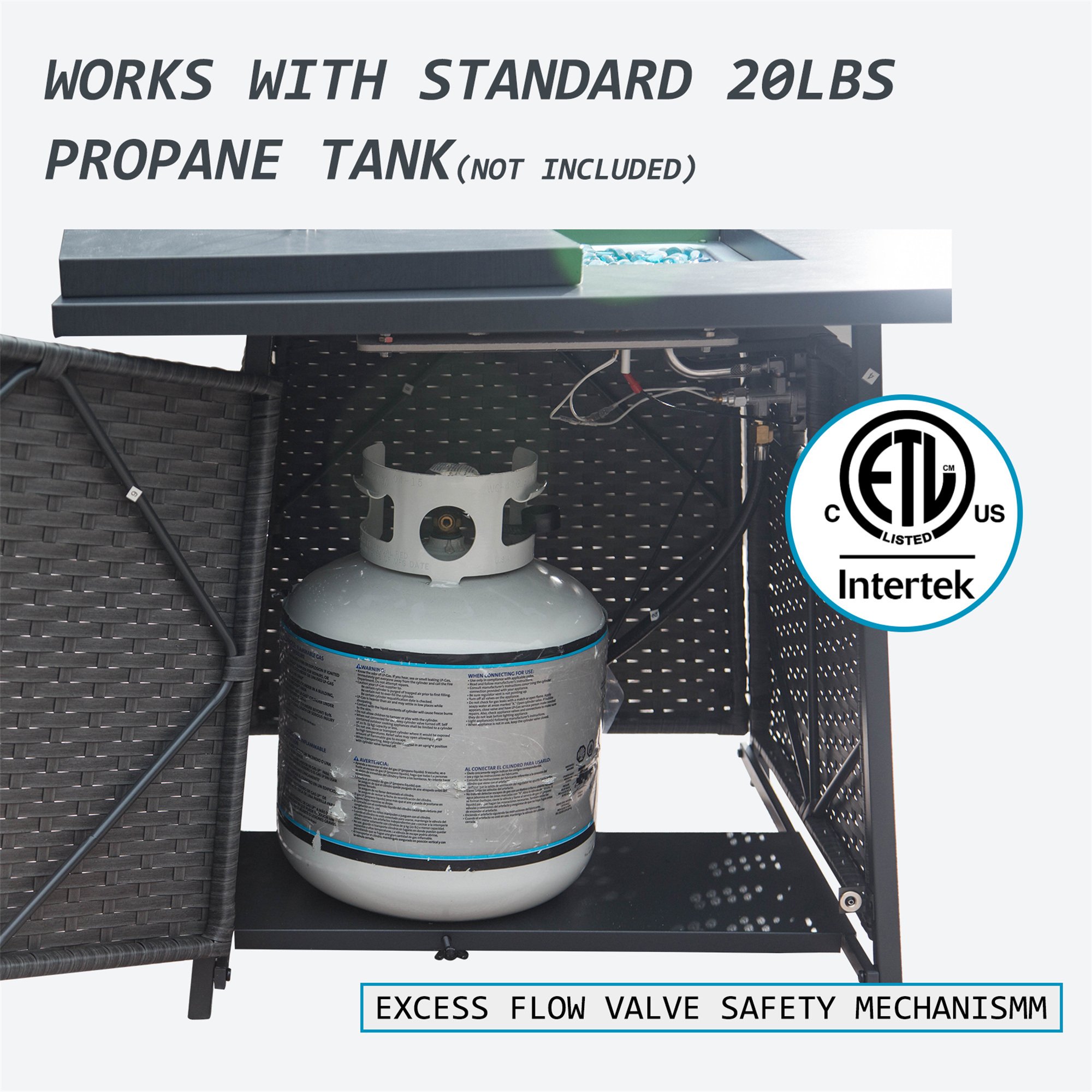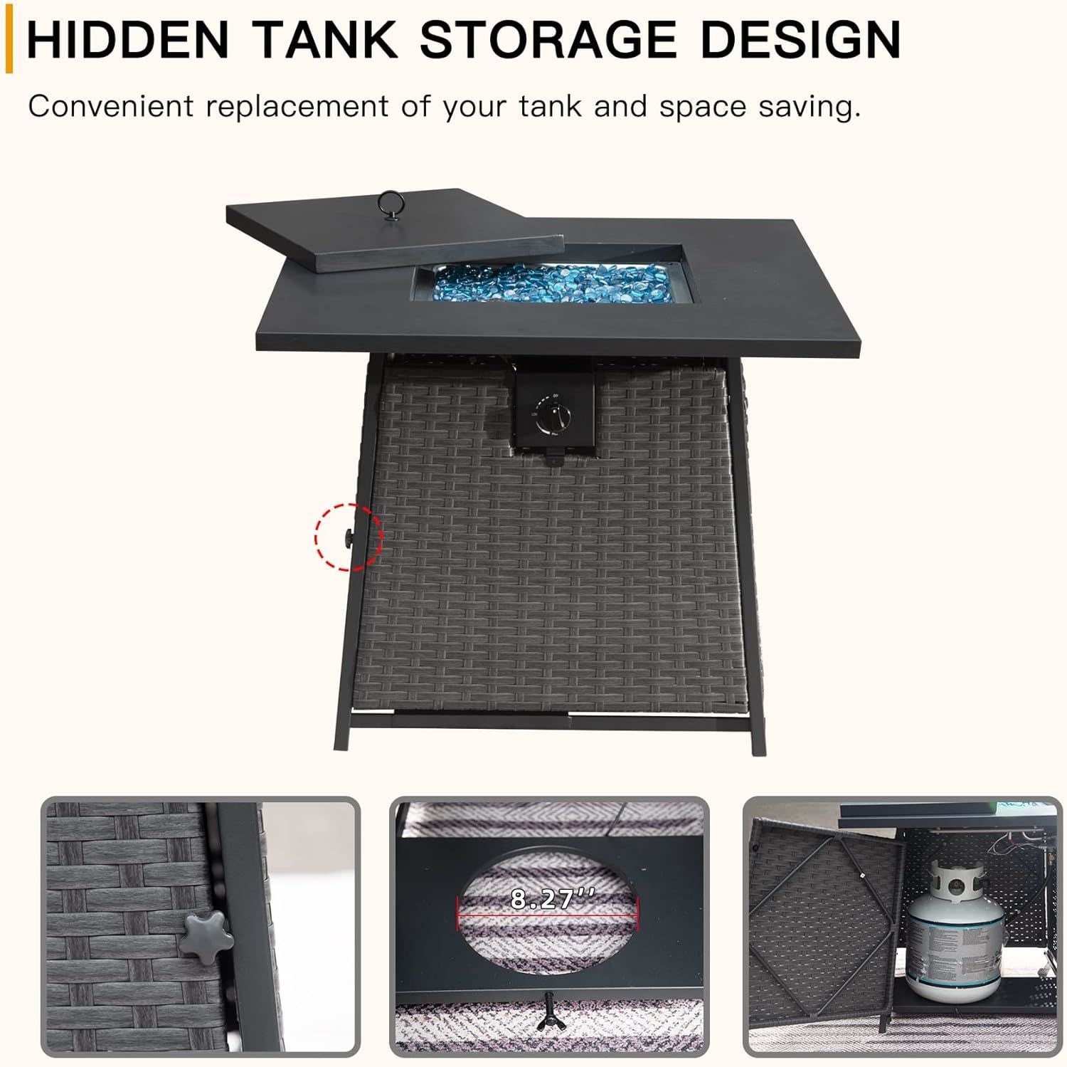 [High Quality & Durable Material]This 28 inch gas fire pit table made with high quality Rust-Proof paint Steel frame, all-weather PE wicker and thicken rust-proof iron tabletop,which could provide a long time service life.