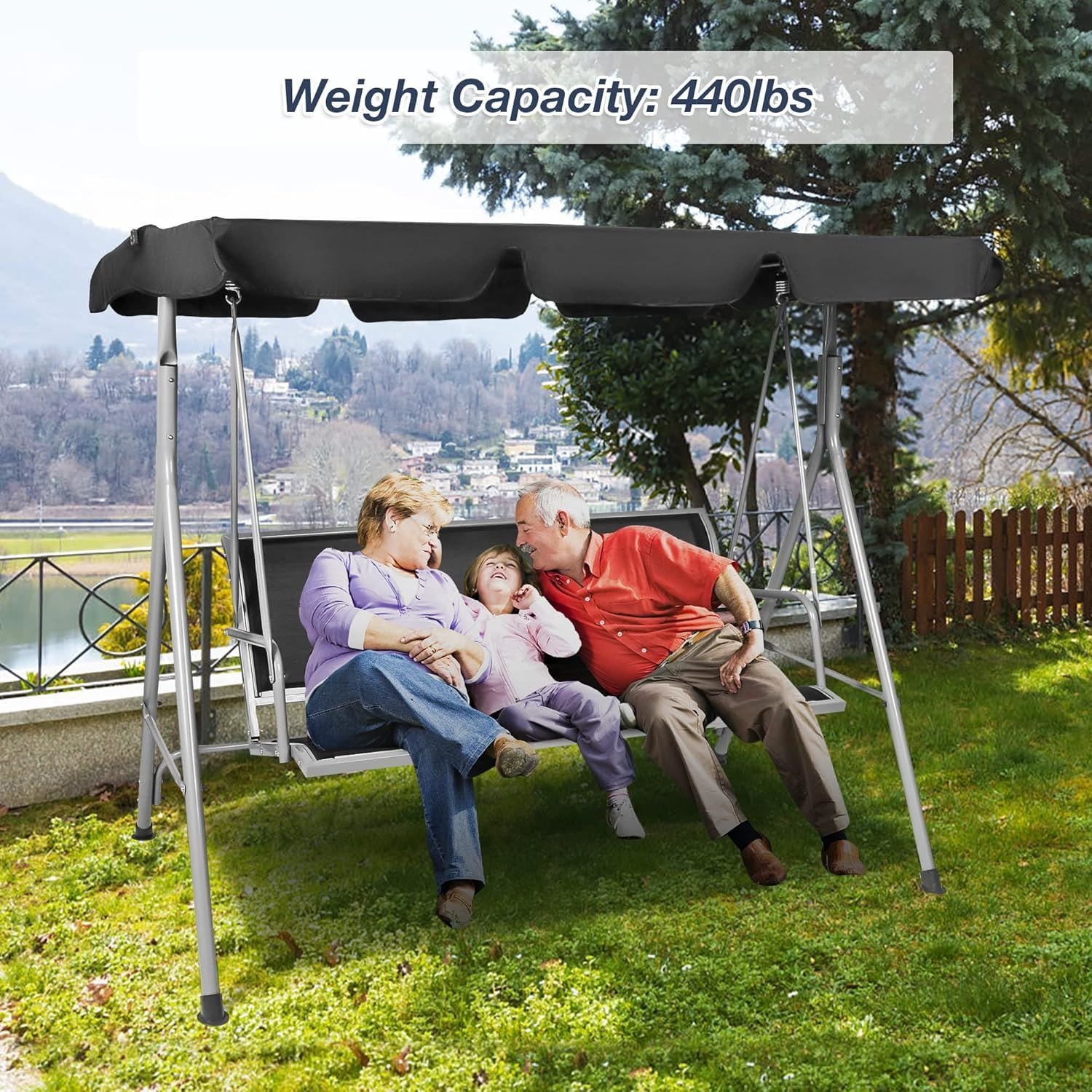 Premium Materials: Our outdoor swing is made of black powder-coated iron and can support up to 440pounds at one time. High-quality, weather-resistant iron frame ensures long-lasting enjoyment for years to come.