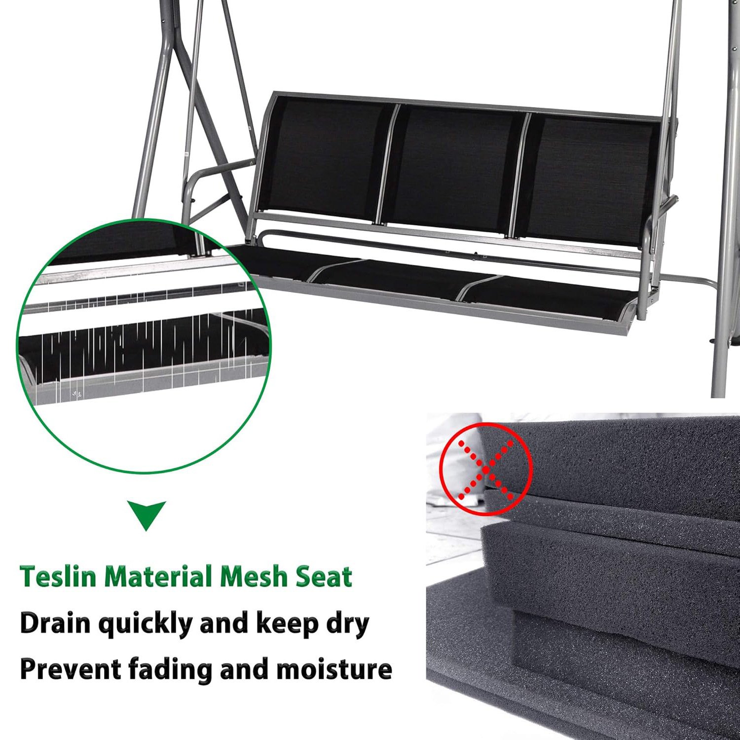 Anti-slip Foot Tips and Wide Seat: The four plastic anti-skid feet pads make the patio swing safer and also prevent the floor from scratching. The spacious bench-style seating has plenty of room for up to three persons to swing and relax together.