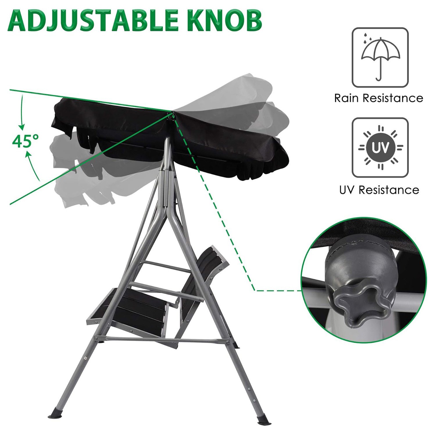 Angle Adjustable Canopy: The angle of the canopy can be adjusted by rotating the controller to provide optimal shade. If you are in the mood for sunbathing, just Loosen the controller to remove the canopy.