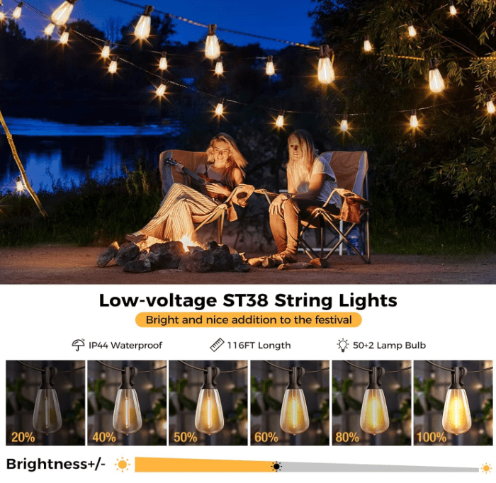 [Create a comfortable and warm atmosphere] -Light up your outdoor space with our 240-foot vintage Edison-style light string. Equipped with 124 ST38 retro Edison style light bulbs, these LED outdoor lights emit a soft, warm light, adding a touch of charm and warmth to any environment. These lights are ideal for backyard parties, weddings, and outdoor cafes, creating a comfortable and inviting atmosphere that makes your guests feel at home