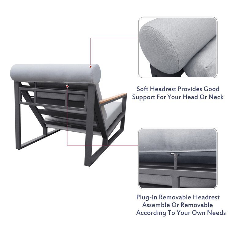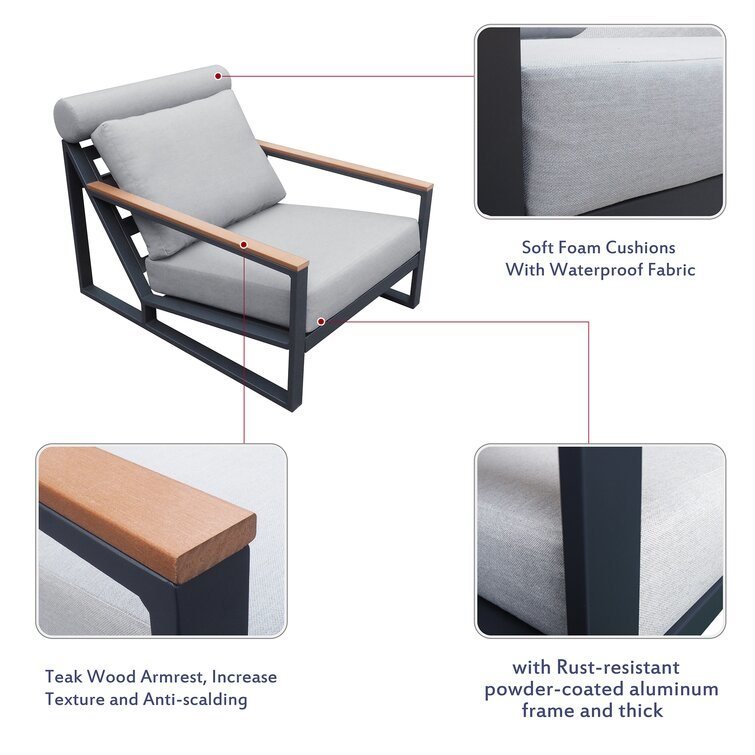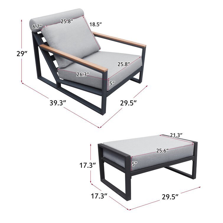 Outdoor Furniture Armchair with Ottoman Sets.It includes one chair and one ottoman with gray aluminum frames and cushions. The black powder-coated aluminum frame it can stands up to wet weather without rusting or molding. This outdoor seating set also comes with cushions featuring water-repellent; fade-protected; and machine-washable zip covers. Enjoy your own little slice of backyard paradise when you're relaxing in the supportive embrace of this premium aluminum framed armchair chaise lounge chair.