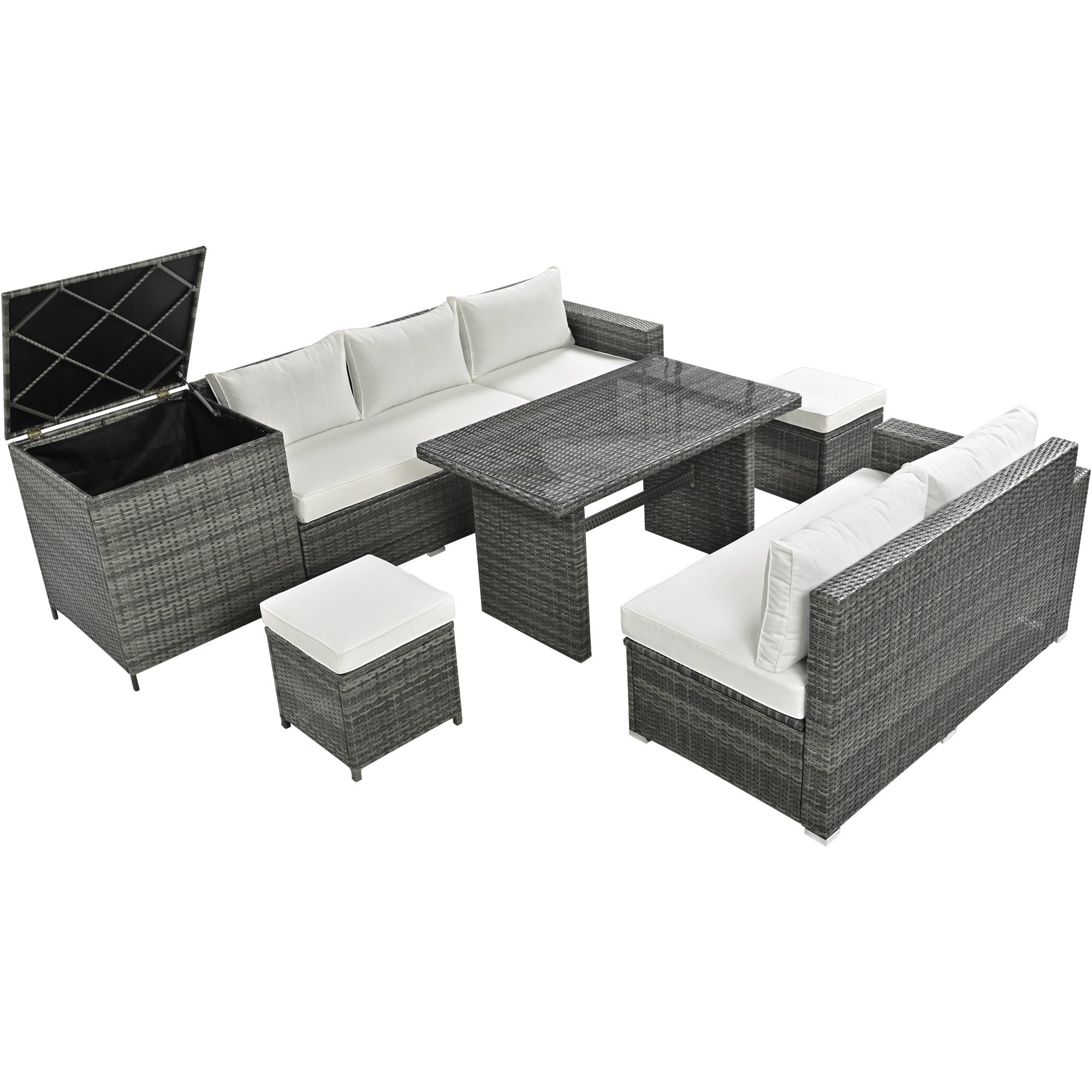 This patio rattan sofa set has a number of storage options that make it a great choice for outdoor use.The loveseat sofa features an openable seat that provides ample storage space for cushions and other items, keeping them out of sight and protected from the elements.In addition to the seating options, the set also includes a gas lift storage box that provides even more storage space for outdoor essentials and is perfect for storing larger items, such as outdoor pillows. Storage capacity for loveseat is 69 gallons and for storage box is 94.6 gallons