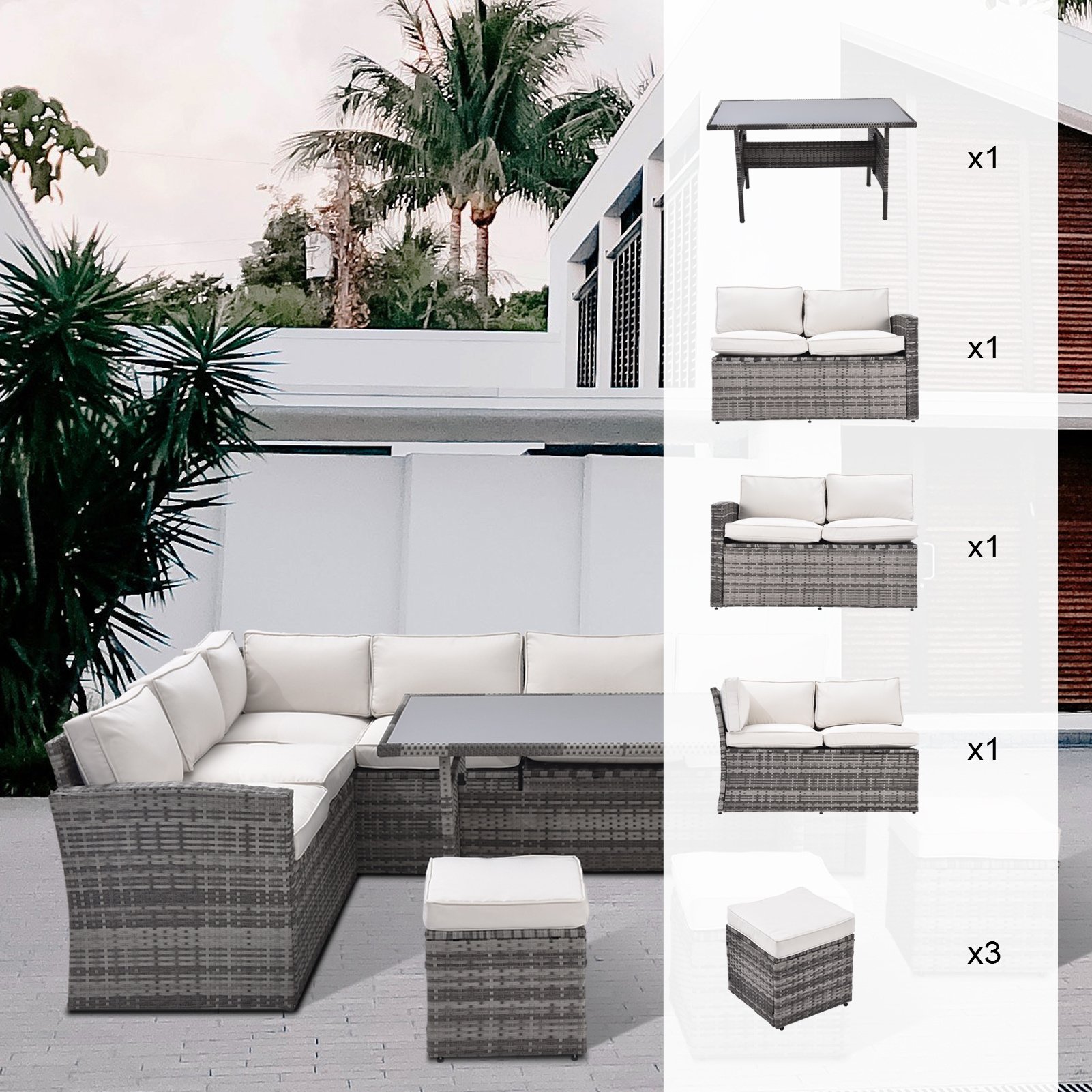 "[Multi Scene Dining Area]:The 7-piece outdoor dining furniture composed of grey PE rattan and beige cushions could go well with any garden landscaping.Including 3corner sectional loveseat sofas,1glass-topped table and 3cushioned ottomans,this set can accommodate up to 9people,providing a cozy space enough for gathering and entertaining.It is portable and removeble.According to combine it into different configurations as you need,it's perfect to create a beautiful and luxurious outdoor living