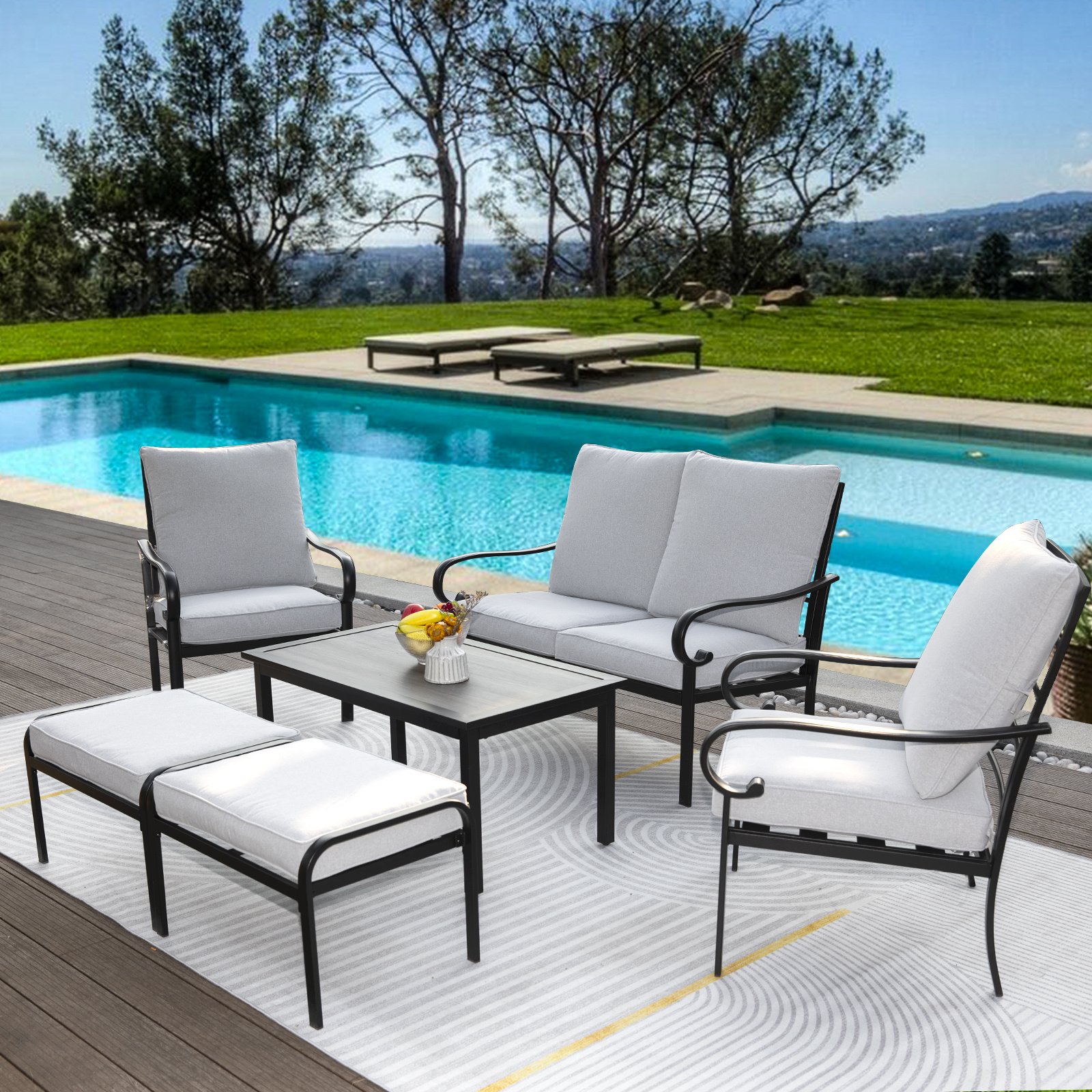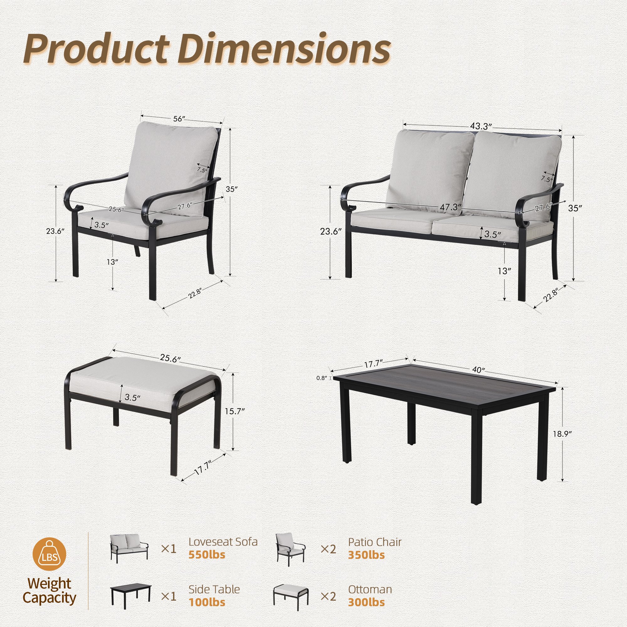 Metal patio furniture set - This conversation sofa set features quality sturdy powder-coated iron frame, abrasion-resistant, no deformation and corrosion. Built with high load-bearing capacity, the loveseat can hold 550lbs, singe patio chairs hold 350lbs, ottoman hold 250lbs.