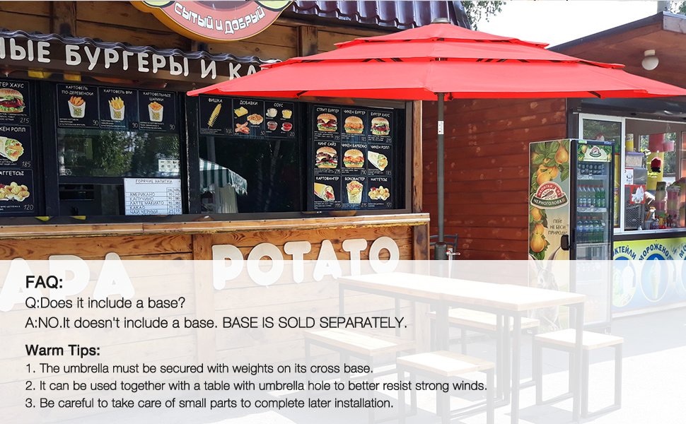 Tips & Maintenance: This umbrella can NOT stand alone. It must be secured with a weighted base (SOLD SEPARATELY). Please close and tie up the umbrella when you don't want to use it, especially in windy and rainy days, so that its life is prolonged.
