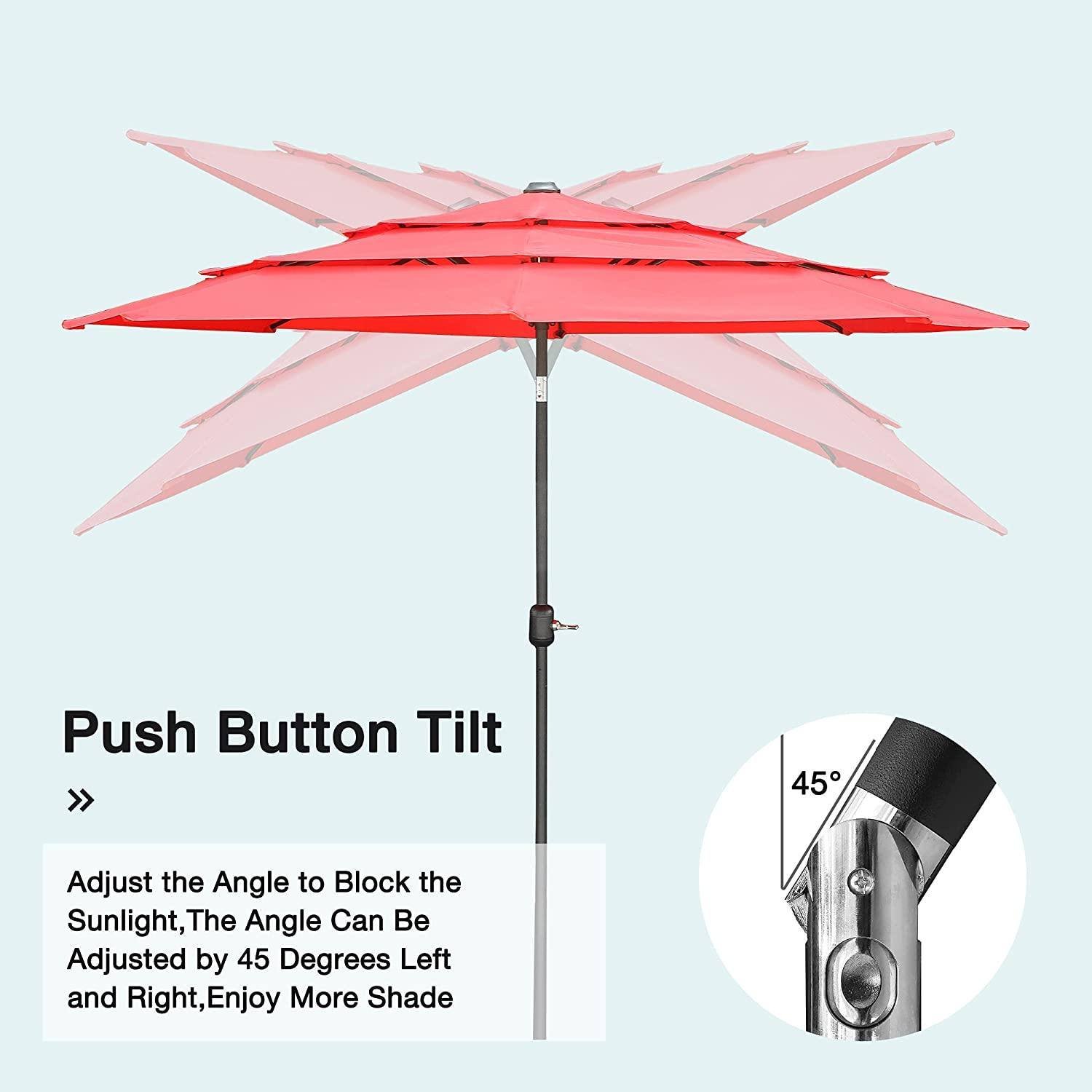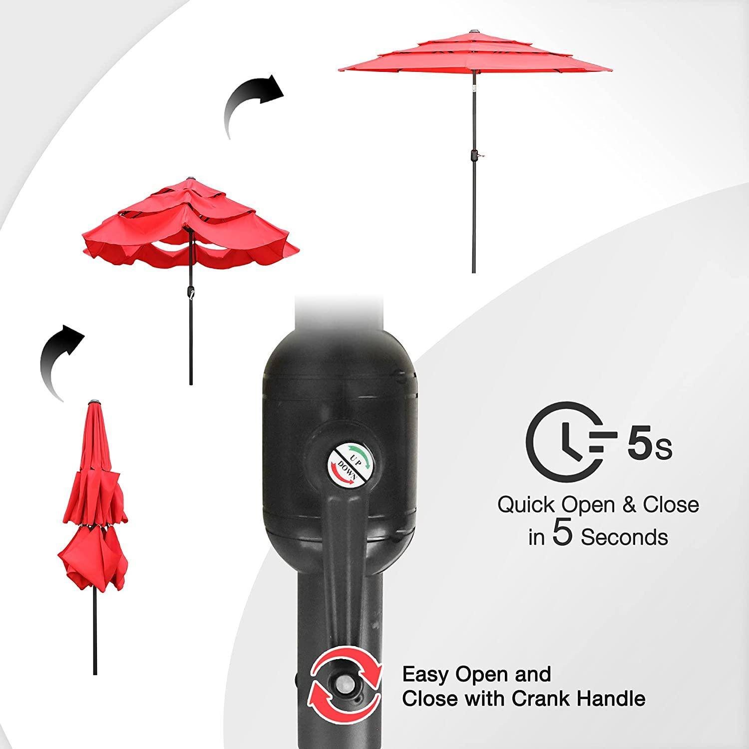 Dual Vented Design: 3 tier top adds fashion and elegance to your patio while providing better air circulation. Hot air or wind will flow through the dual vents quickly, which makes the umbrella more stable and cooler underneath on summer.