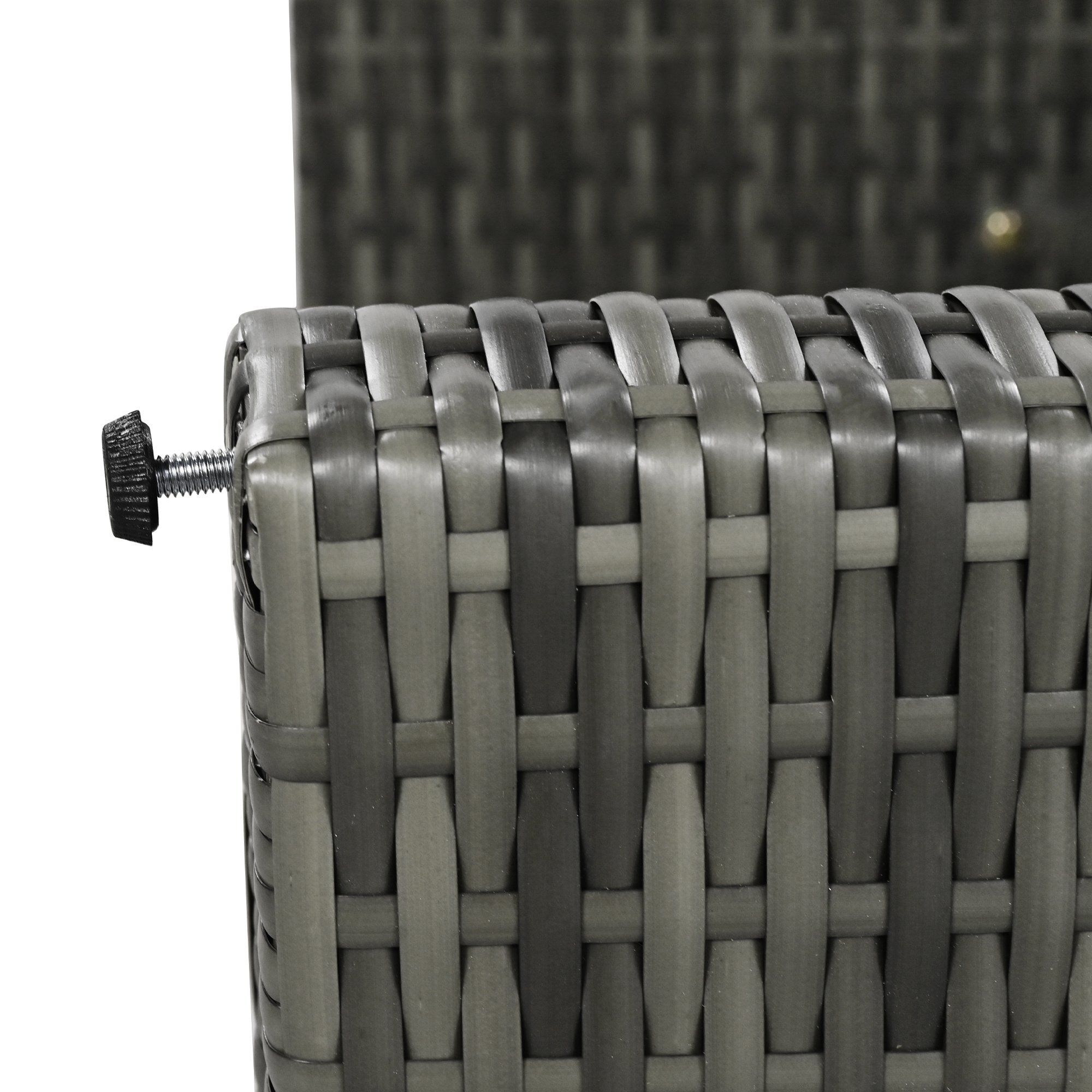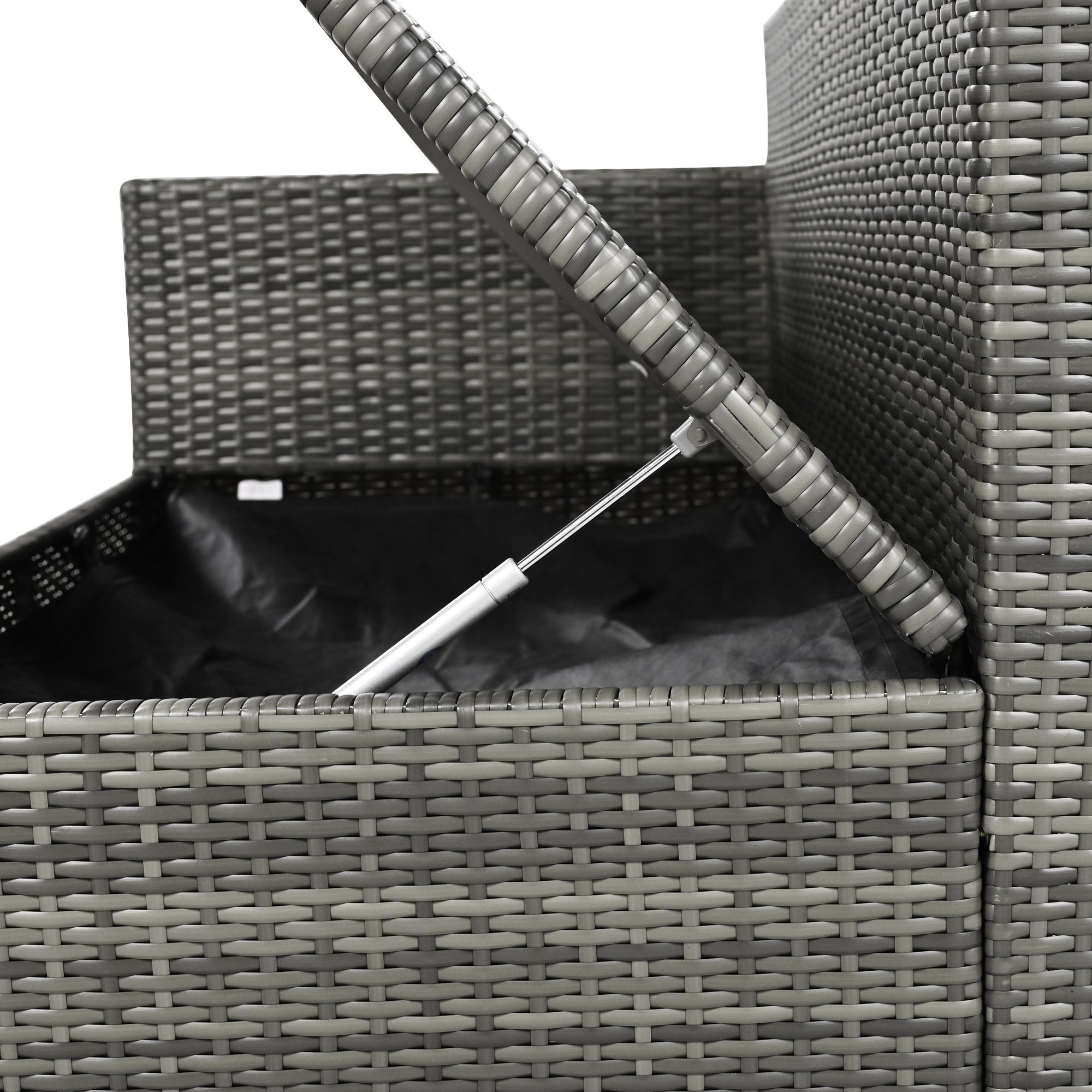 This patio rattan sofa set has a number of storage options that make it a great choice for outdoor use.The loveseat sofa features an openable seat that provides ample storage space for cushions and other items; keeping them out of sight and protected from the elements.In addition to the seating options; the set also includes a gas lift storage box that provides even more storage space for outdoor essentials and is perfect for storing larger items; such as outdoor pillows. Storage capacity for loveseat is 69 gallons and for storage box is 94.6 gallons