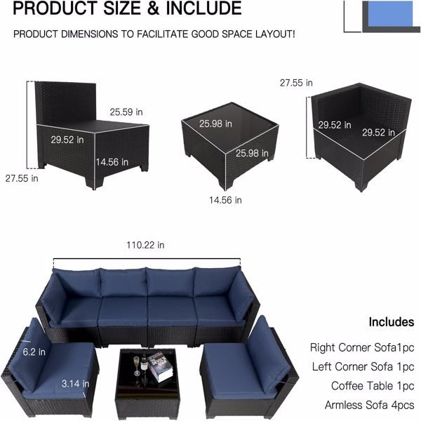 • ❤[Set Includes]7 pieces outdoor furniture sets come with 1 x Right Corner Sofa,1×Left Corner Sofa, 1×Coffee Table, 4x Armless Sofa.(The product is shipped in three boxes ) When you don' t use it, advise you to take cushions inside or buy a cover for longer service time.