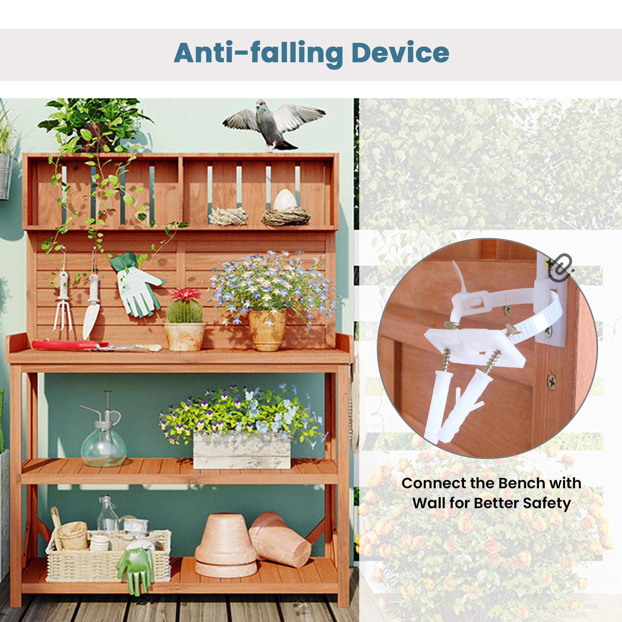 Anti-Falling Safety DeviceThere is not always flat in the garden. For your safety in setting the potting bench; it is designed with an anti-falling device. Just connect the device with wall for better safety. To strength stability; 4 supportive bars are offered to fixed in the lower shelves. They can be fixed in any corner until the table is stable.