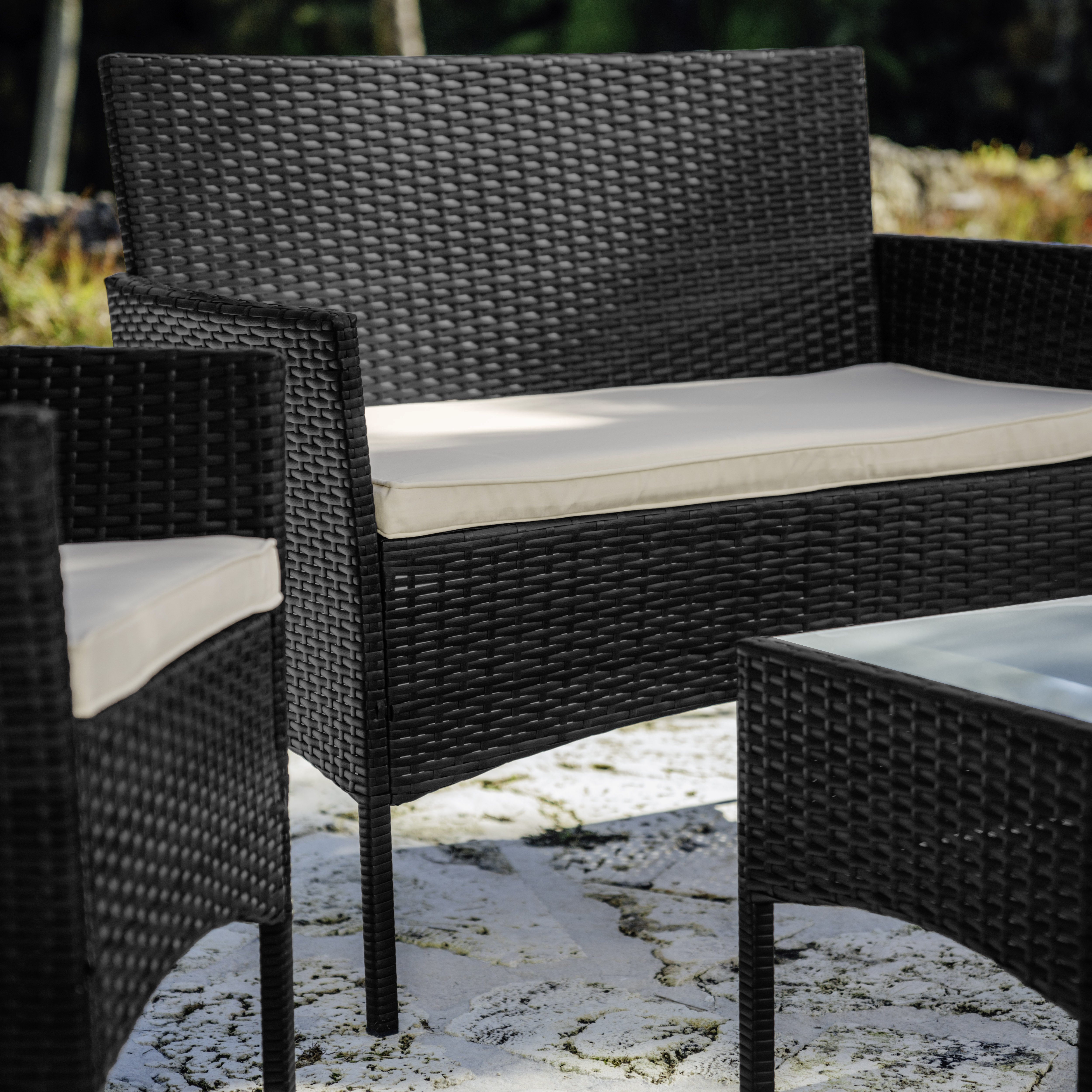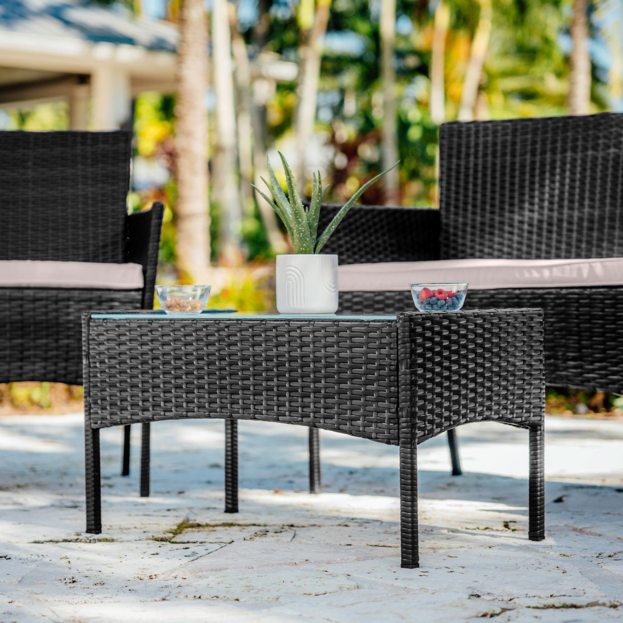 Home > 4 Piece Patio Furniture Wicker Conversation Set-• 1x Love Seat • 2x Arm Chairs • 1x Glass Coffee Table