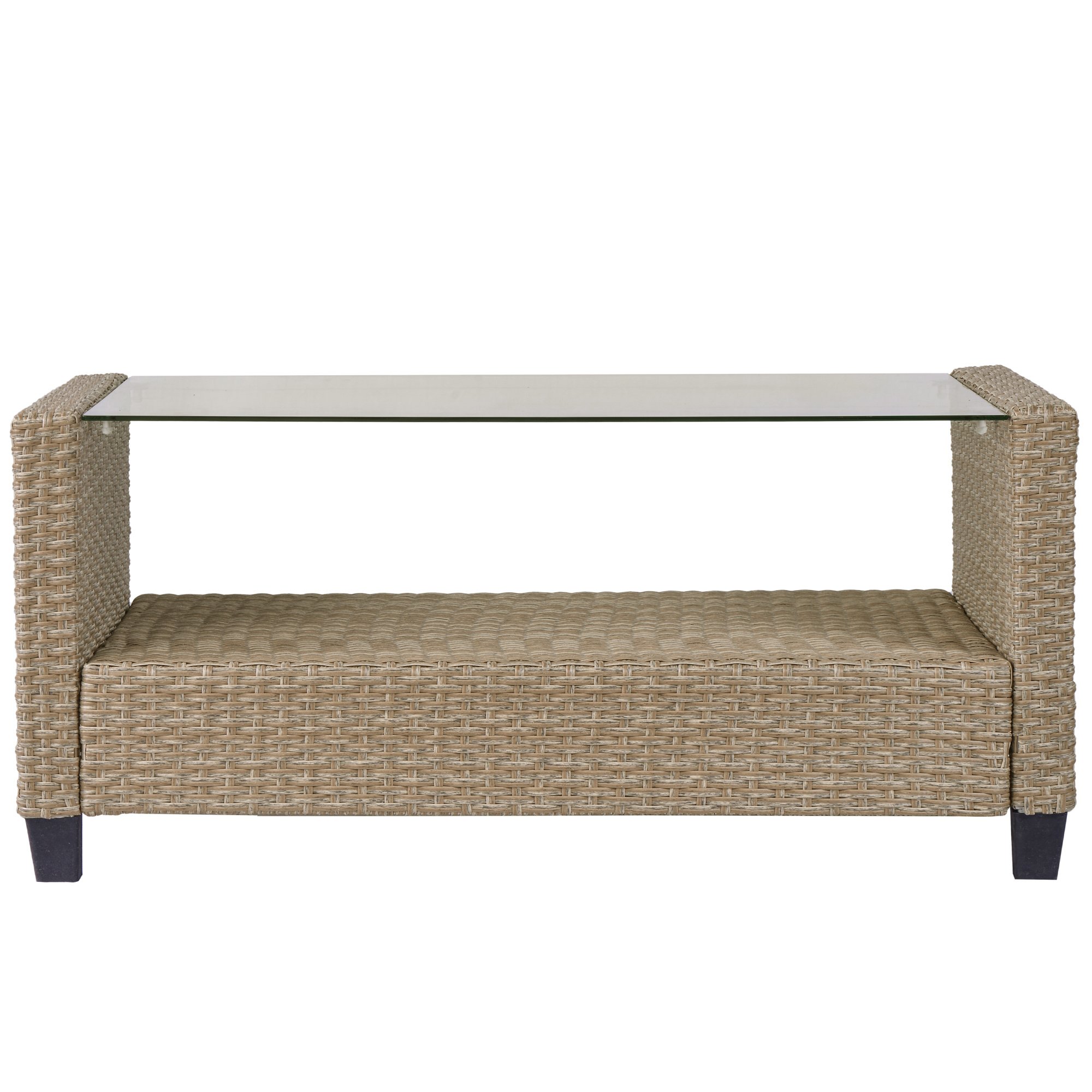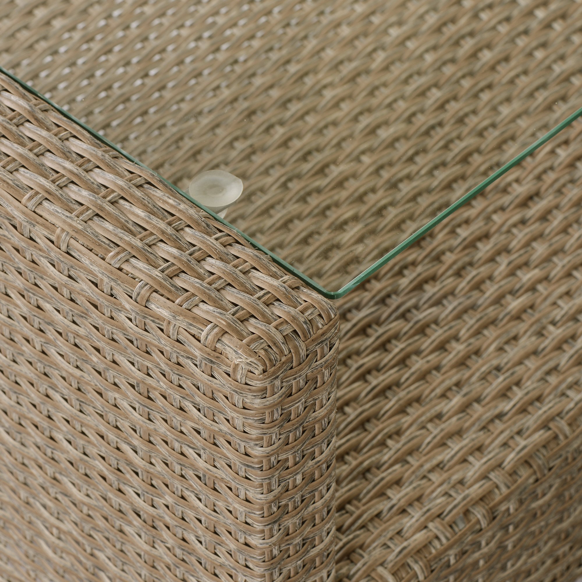 Give your backyard a classy polished seating space with our 4-Piece Conversation Patio Set. Charming in design; this set features a 2 seater sofa; lounge sofa; coffee table and side sofa chair. Instantly create a cohesive sectional by simply pushing the 2 seater sofa and lounge sofa together; or separate them if you want your patio set to cover a larger area of space. Crafted with a classic beige thick woven rattan wicker weaving reinforced with rust resistant steel; this patio set is resistant to water; cracking; splitting and sun rays so it can last years to come. The center coffee table features a modern floating glass surface perfect for placing food and drinks to make spending time outdoors even more enjoyable. Lean back and relax for hours on end with the thick high density foam cushions upholstered in soft fabric covers that are formulated for easy spot cleaning; and enjoy the four back cushions that feature charming button tufting for an elegant appearance.