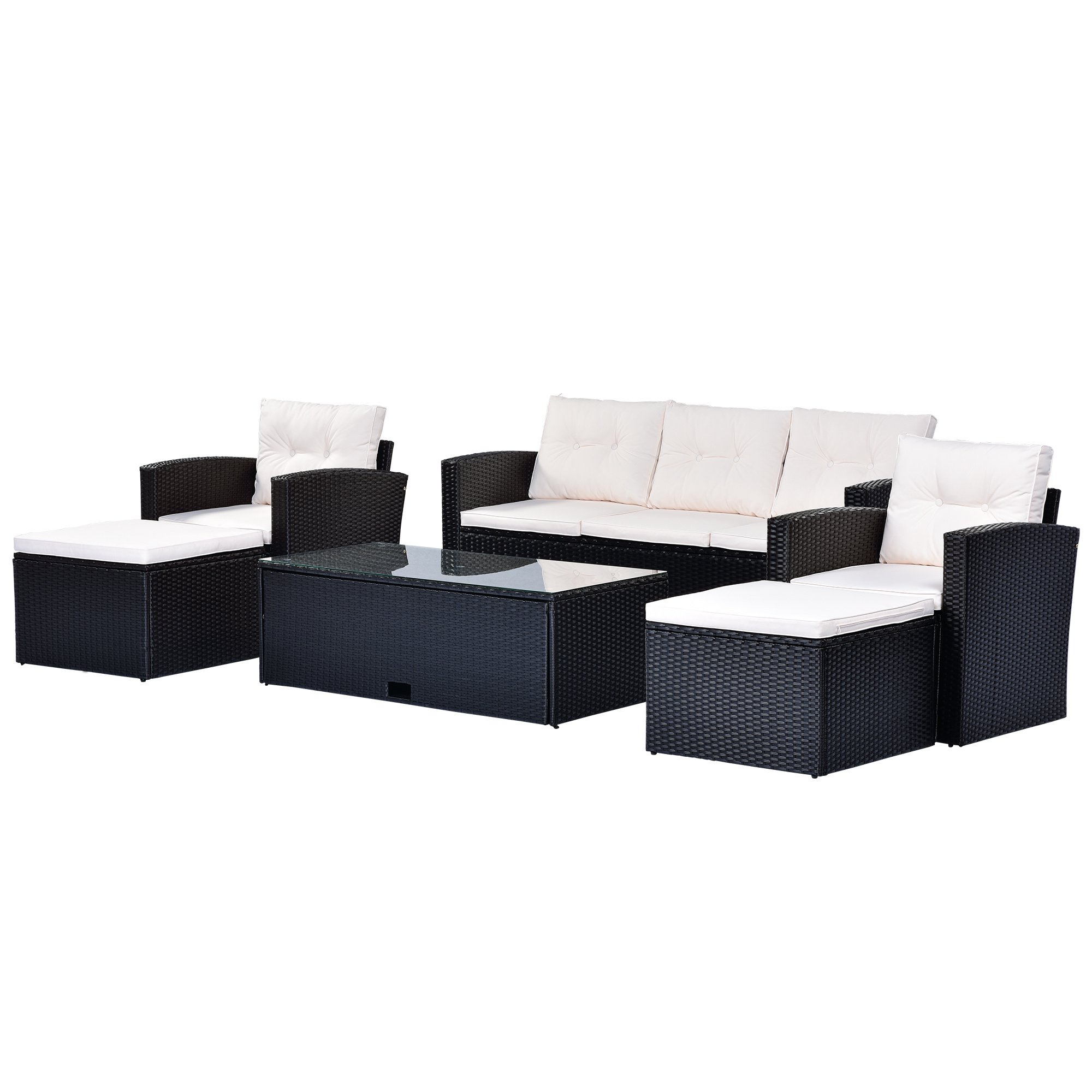 6-piece All-Weather Wicker PE rattan Patio Outdoor Dining Conversation Sectional Set with coffee table, wicker sofas, ottomans, removable cushions (Black wicker, Beige cushion)