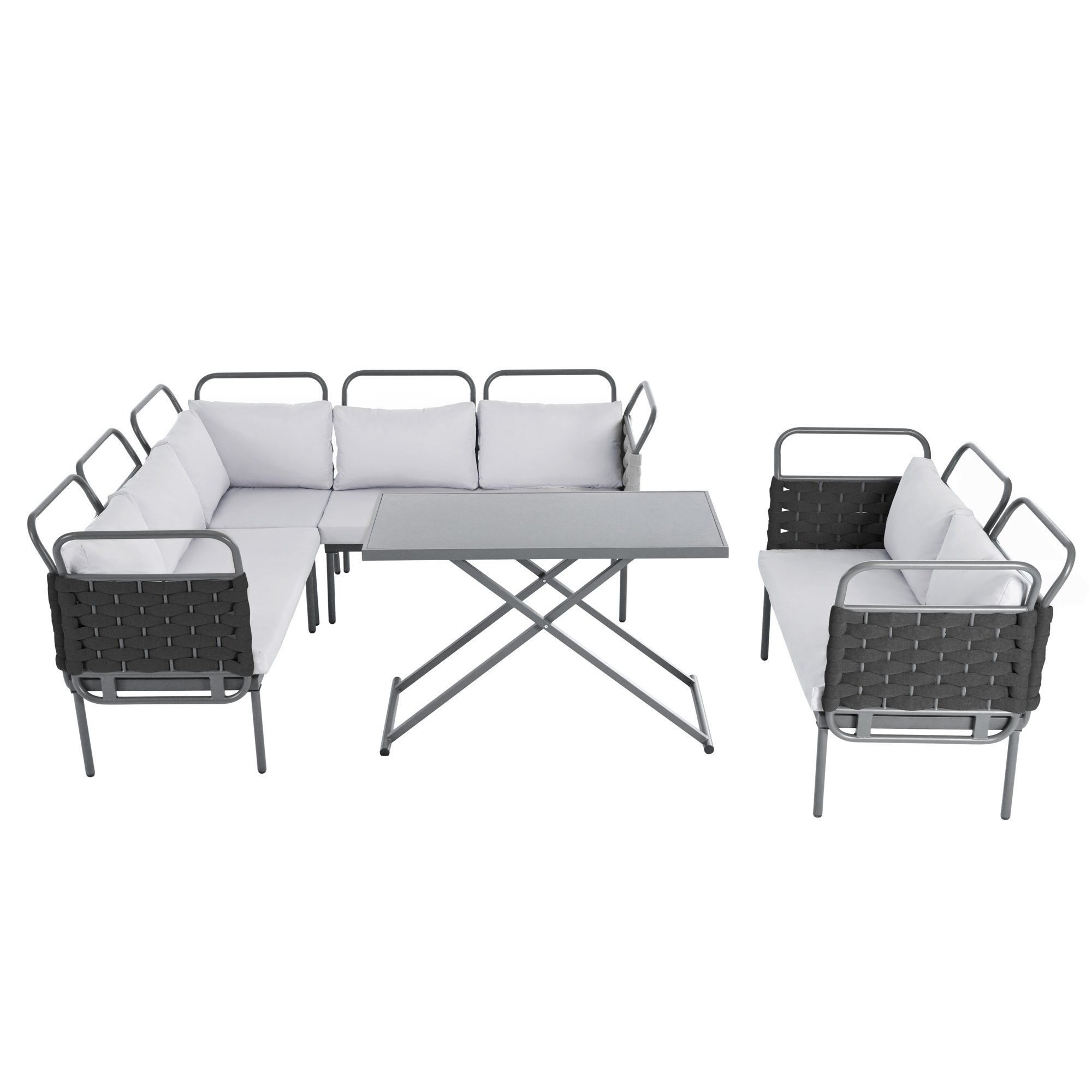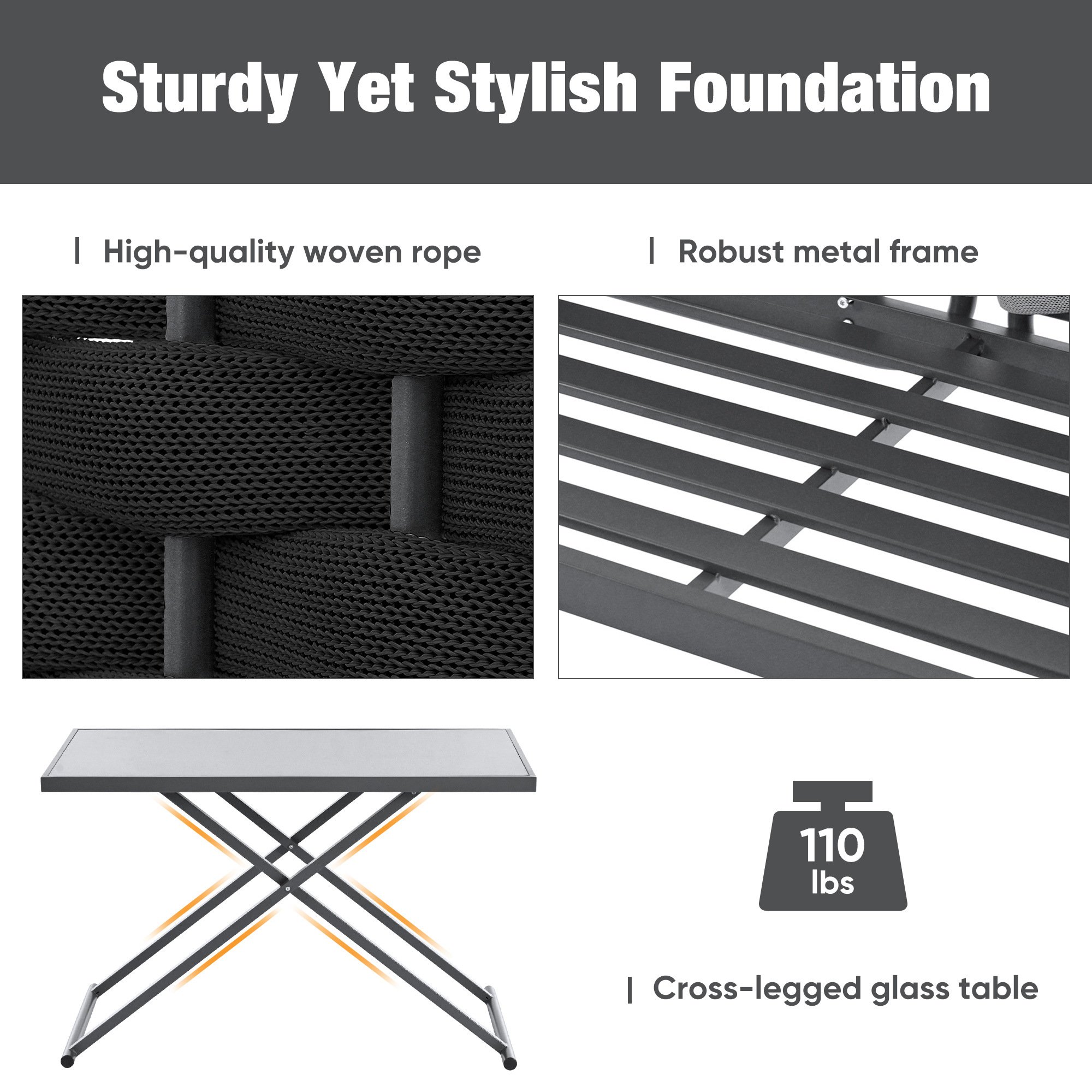 Sturdy Yet Stylish FoundationWith a robust metal frame elegantly entwined with high-quality woven rope, this ensemble offers a sanctuary for up to 7 guests. It's the perfect stage for endless conversations, laughter, and the creation of memories, wrapped in the warmth of sophisticated design and resilient materials.