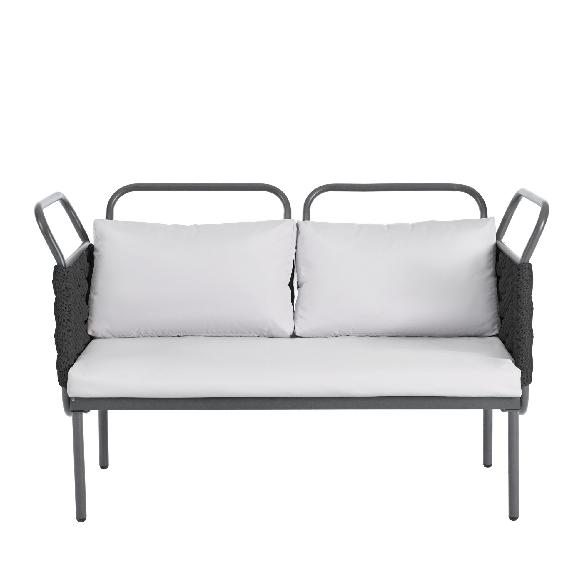Looking to turn your backyard into the envy of the neighborhood without breaking a sweat? Our 5-piece sofa set is your answer! Designed to comfortably seat up to 7 people, it boasts a durable metal frame, chic woven rope, and allows for various configurations. This ensemble includes 3 loveseats, 1 corner sofa with ergonomically curved backrests and armrests, plus a fashionable glass table with cross legs. It's accessorized with 8 pillows and 4 cushions, all featuring water-resistant, all-weather fabric with removable and washable covers, in 2 stylish colors. Perfect for any outdoor gathering!