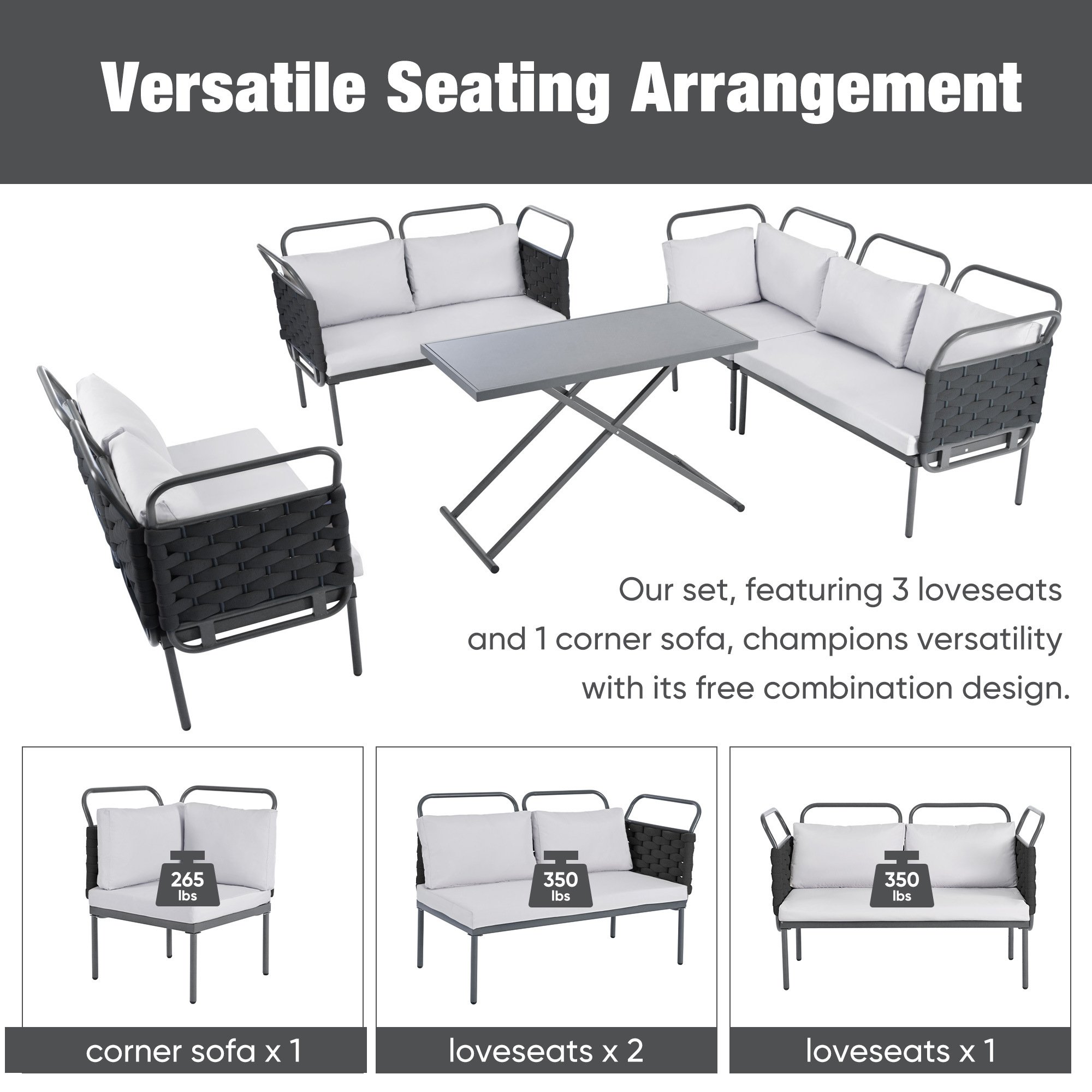 Versatile Seating ArrangementOur set, featuring 3 loveseats and 1 corner sofa, champions versatility with its free combination design. Whether you're hosting a cozy family reunion or a lively party, you can tailor the arrangement to fit the occasion perfectly.