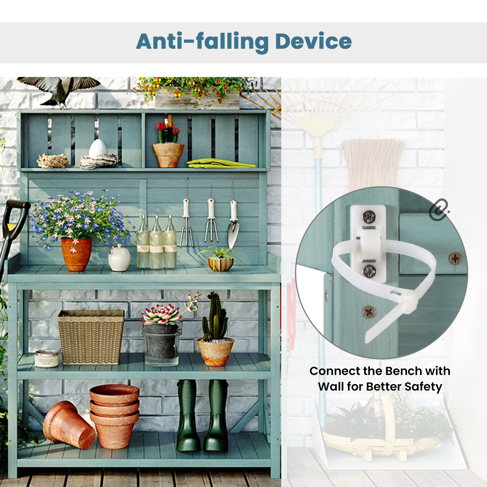 [Anti-Falling Safety Device] There is not always flat in the garden. For your safety in setting the potting bench, it is designed with an anti-falling device. Just connect the device with wall for better safety. To strength stability, 4 supportive bars are offered to fixed in the lower shelves. They can be fixed in any corner until the table is stable.