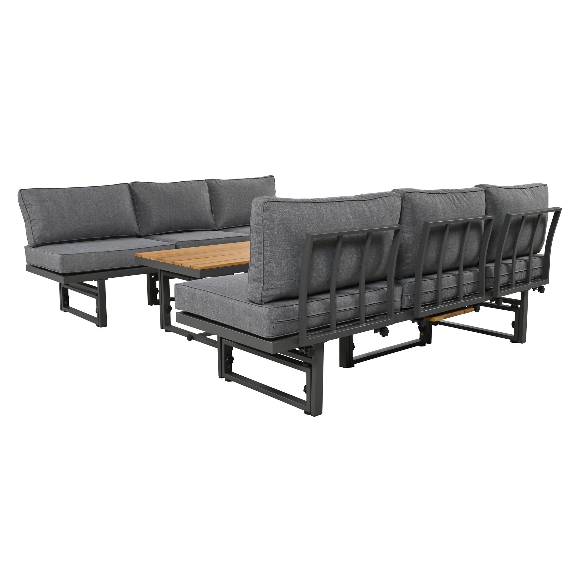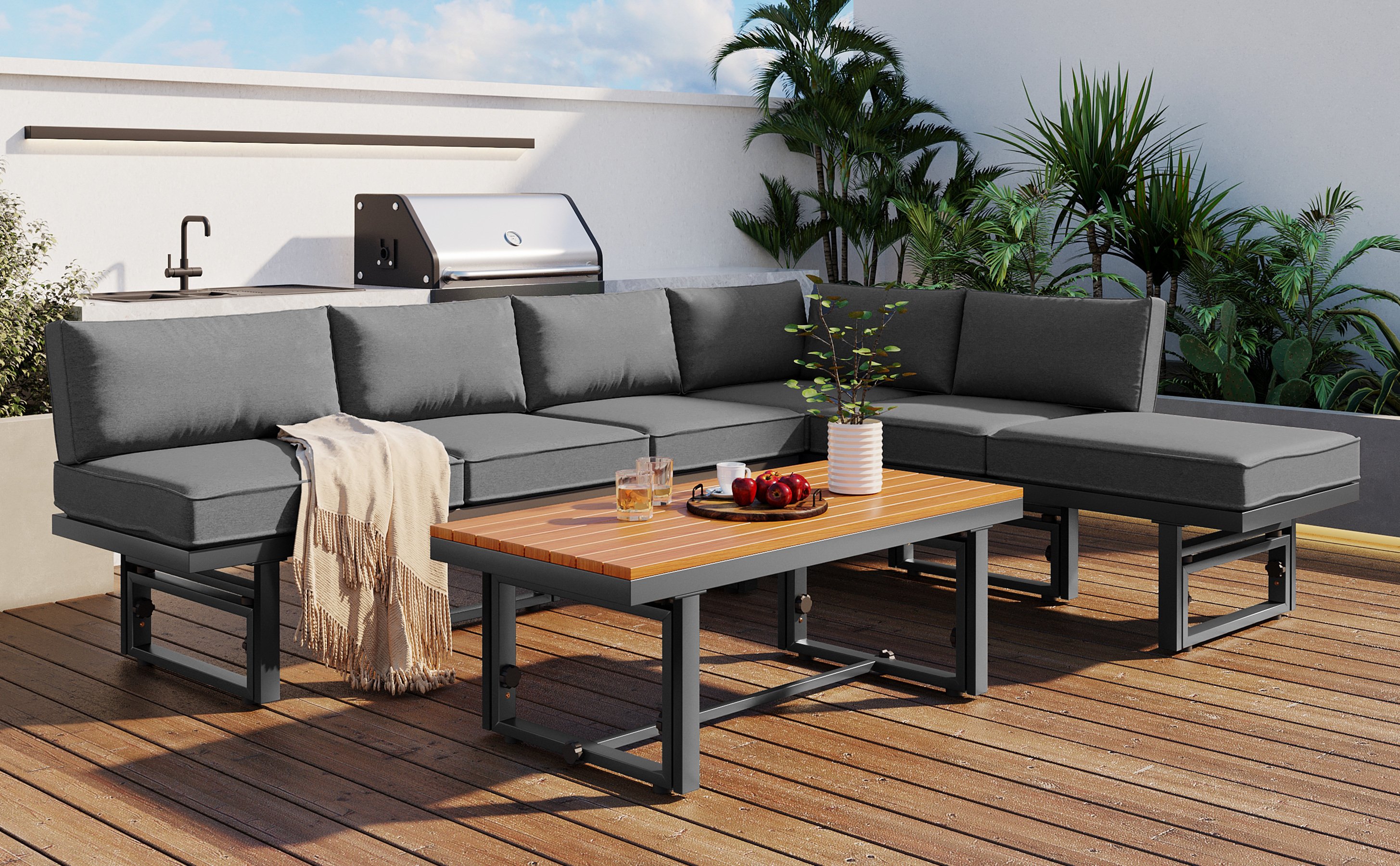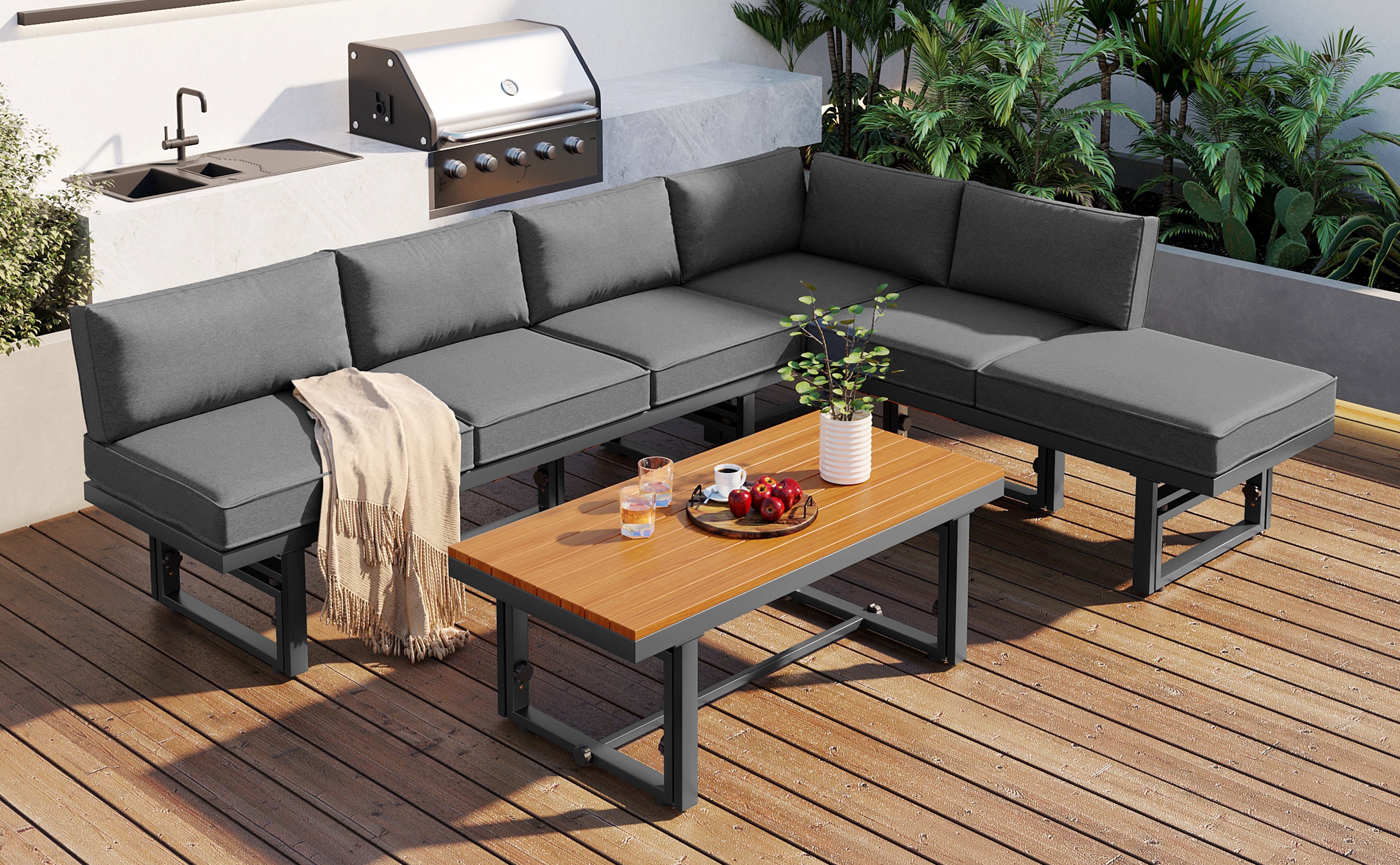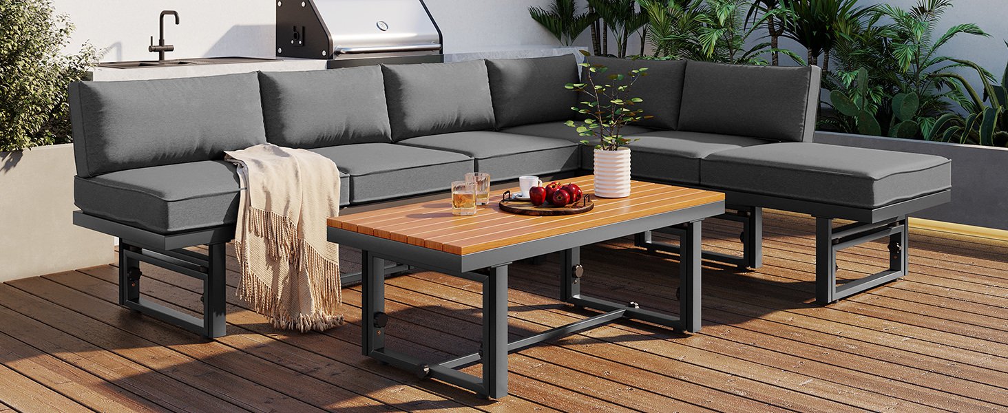 Versatile Use: This sectional sofa set offers endless possibilities for configuration and use, thanks to its adaptable design. Whether lounging with friends or enjoying a cozy evening outdoors, this versatile sofa set adapts to your every need, unleashing its full potential with limitless possibilities for creative use and arrangement. Whether you're sipping cocktails by the poolside or basking in the warm sunlight, this versatile sofa set is your ultimate companion for leisurely pursuits.