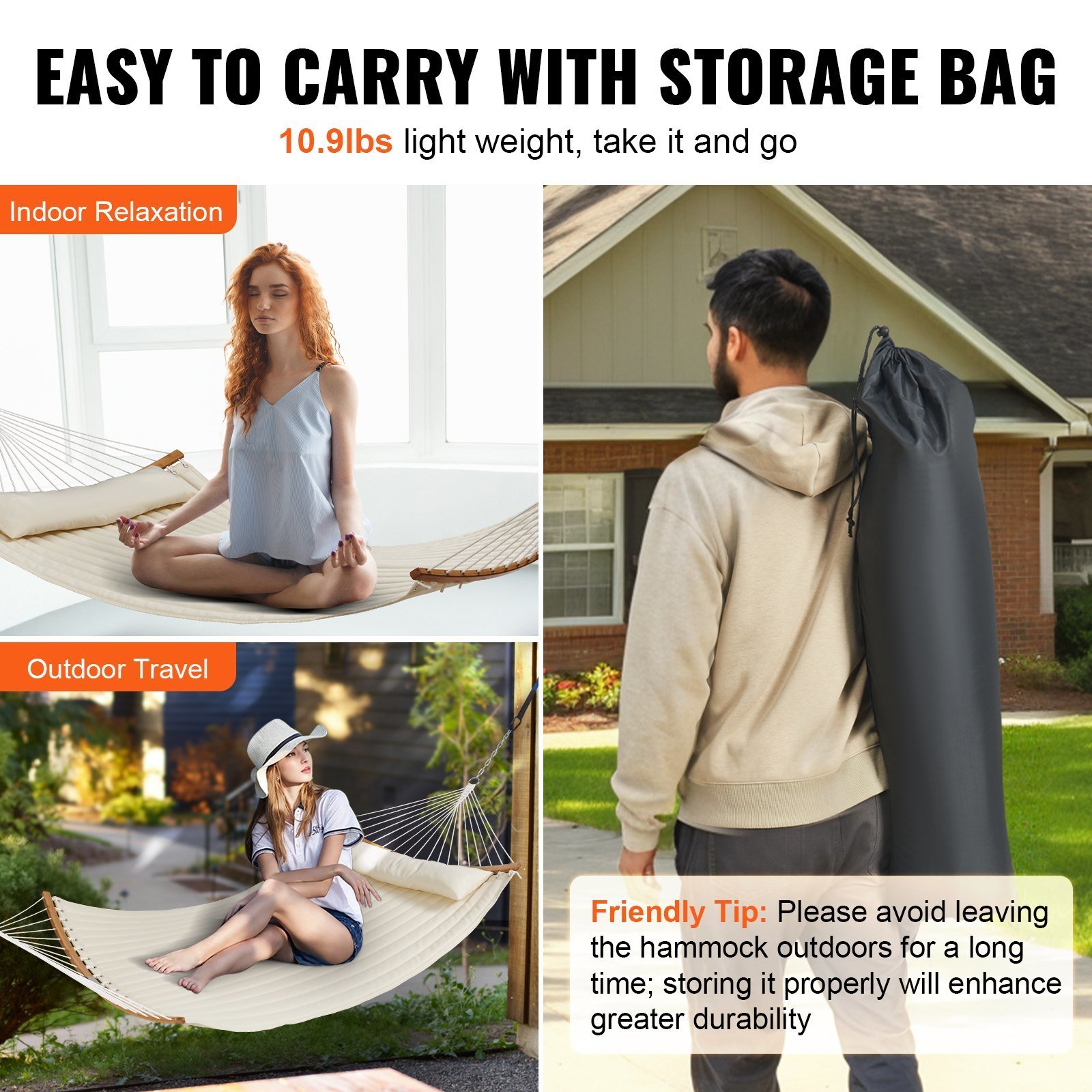 3.Quilted Hammock: Double hammock is made of high quality double-layered quilted polyester and cotton. We've upgraded the quilted cotton from 140g to 200g and reinforced the ends with tough stitching, ensuring it withstands outdoor use without tearing or fading.